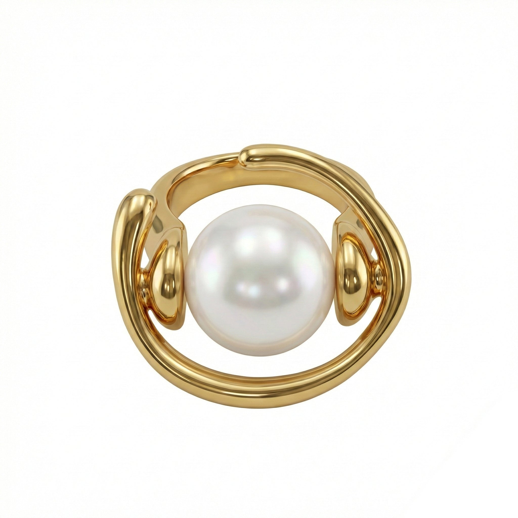 Diseño escultural de líneas fluidas y acabado High-Polish. Su estructura de metal continuo crea una órbita orgánica que sostiene, en tensión visual, una perla esférica central. Una pieza de arquitectura moderna que equilibra volumen y ligereza.