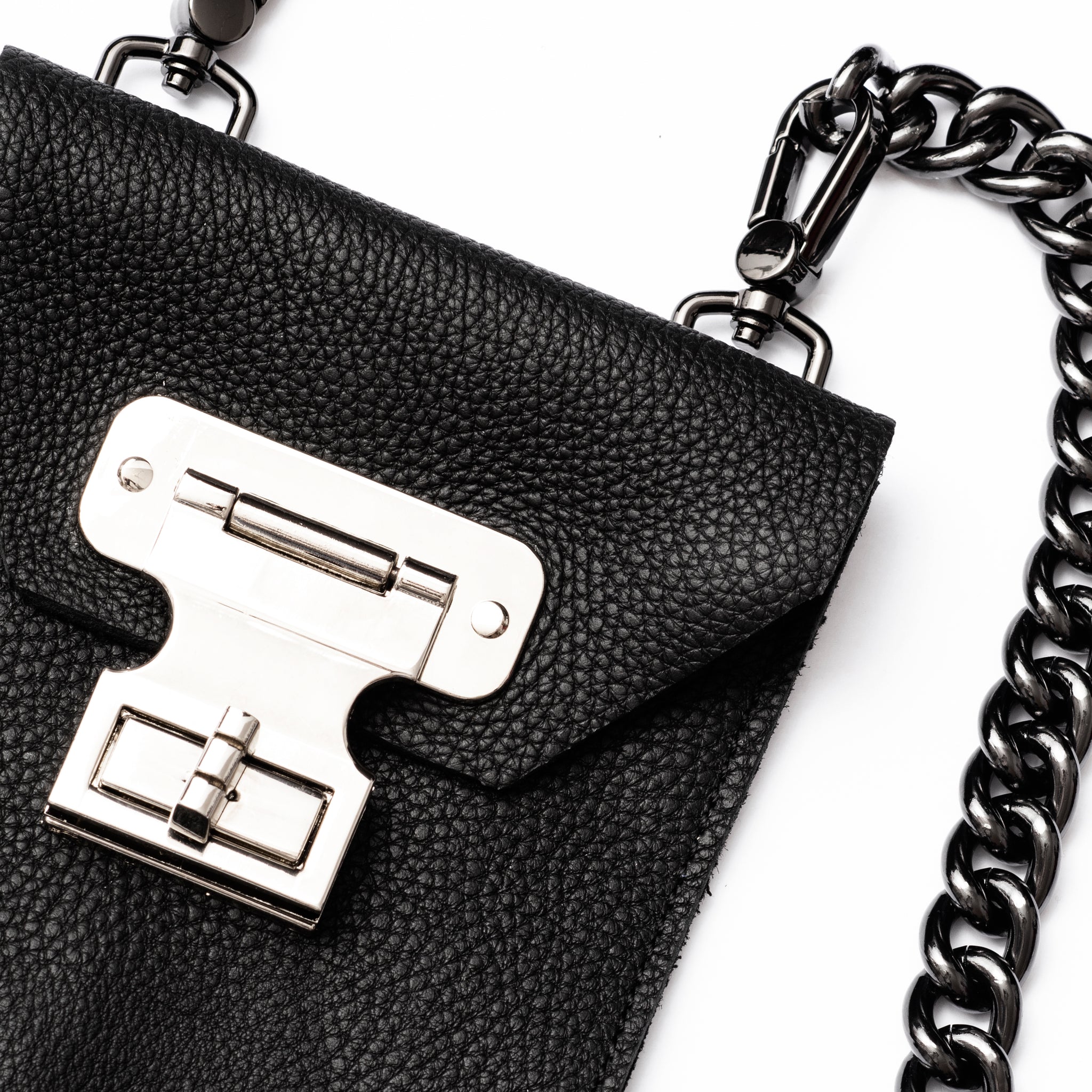 Bolso confeccionado en cuero de alta resistencia, equipado con una hebilla aeronáutica de metal fabricada con aleación metálica de grado industrial y acabado en pintura mate. Incorpora herrajes y cadena de metal pavonados, un tratamiento superficial que mejora la durabilidad, la resistencia a la corrosión y la estabilidad del color, aportando un aspecto técnico, sobrio y de alta calidad.