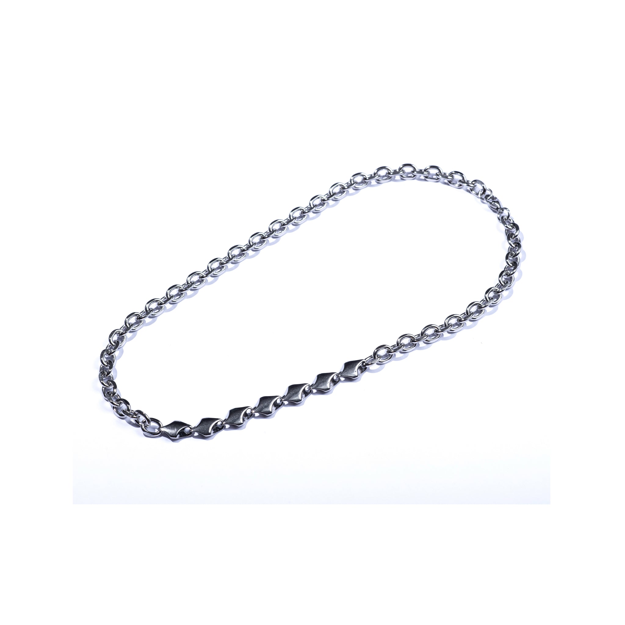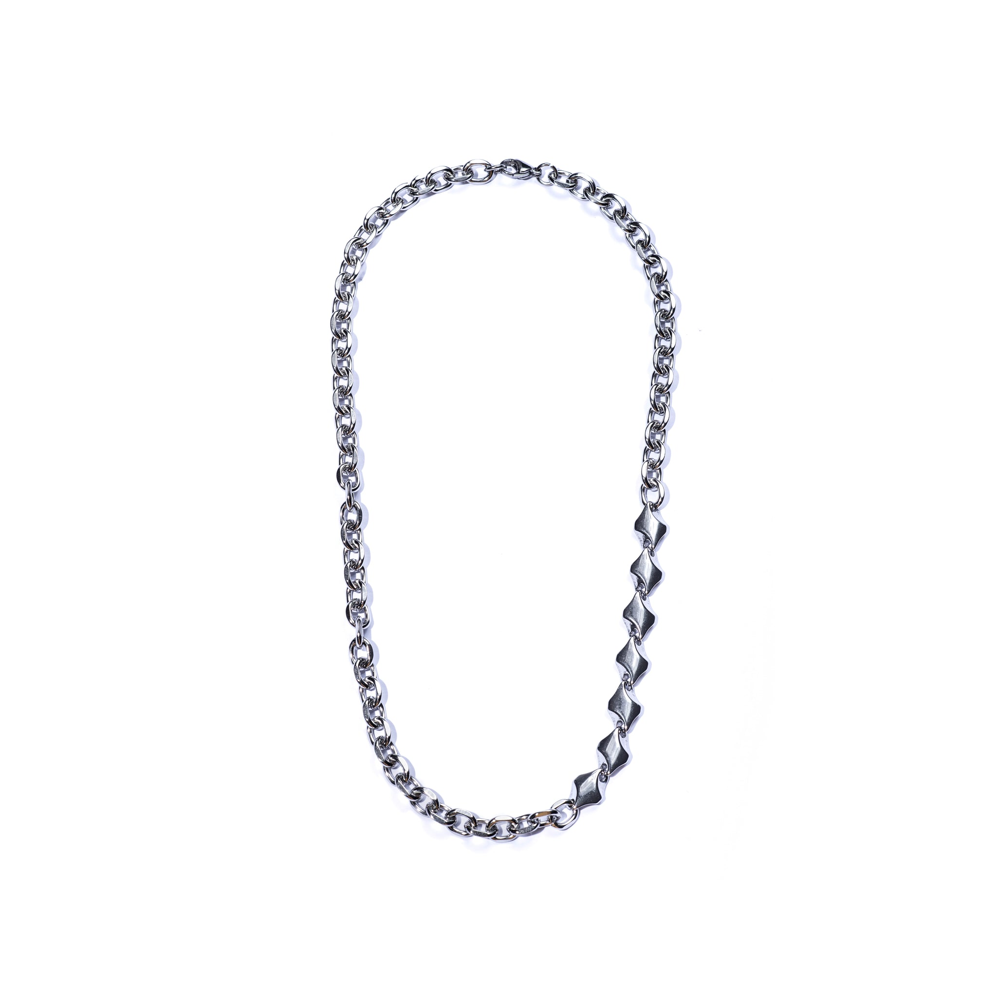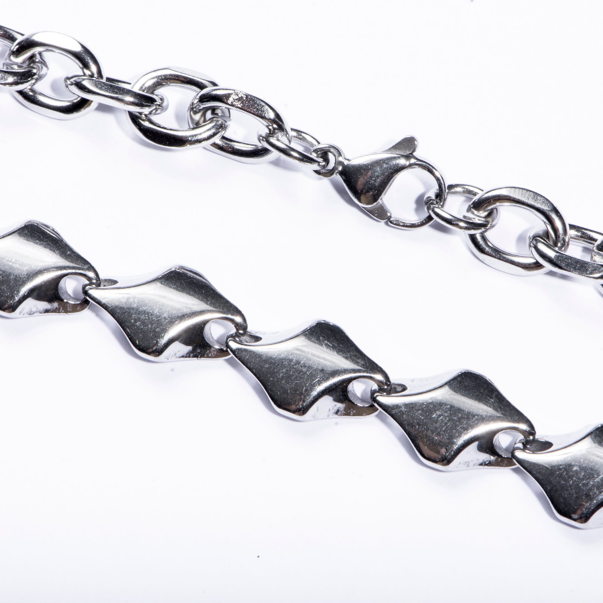 Cadena en acero pulido con links esculpidos que destacan al frente y aportan identidad a la pieza. Mantiene una silueta continua con un perfil definido y moderno, pensado para elevar cualquier look.