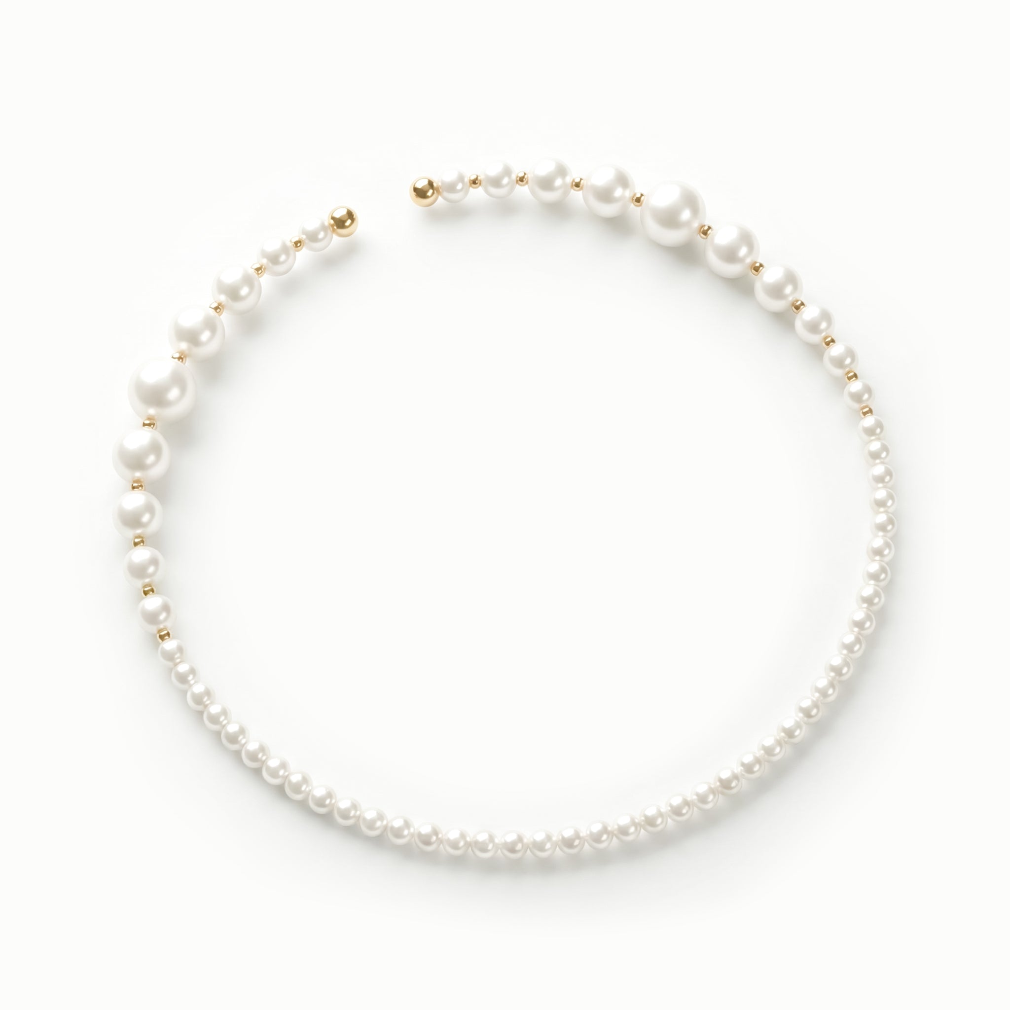 Collar con secuencia de perlas en crescendo (aumento progresivo) está puntuada rítmicamente por micro-esferas de oro, creando una textura visual dinámica y un ajuste ergonómico envolvente.