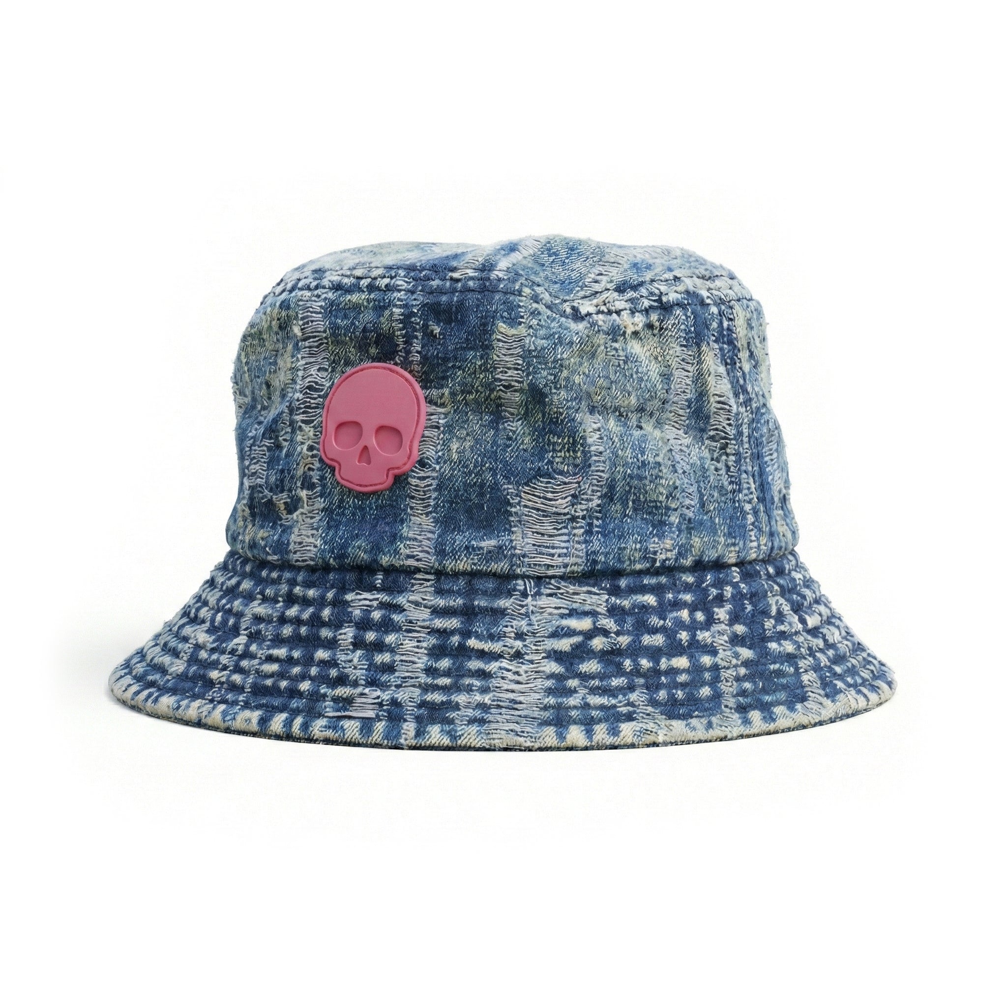 Sombrero de pescador confeccionado en Heavy Denim con tratamiento de lavado ácido (Acid Wash). Su acabado Raw Edge Distressing (deshilachado crudo) crea una textura caótica y voluminosa. El parche de silicona central (Rubber Patch) en Hot Pink rompe la estética ruda con un acento de color Pop-Punk.