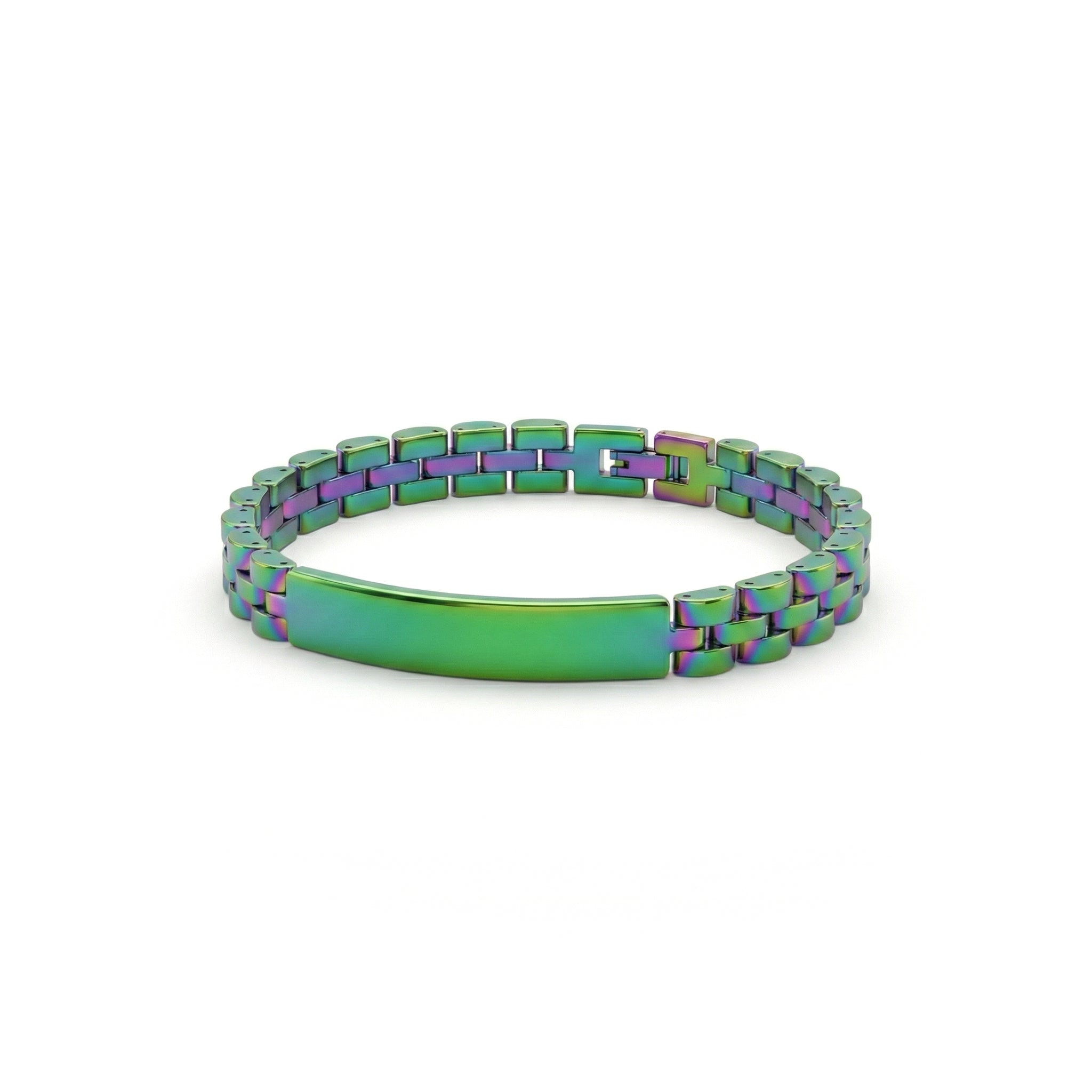 Pulsera de eslabones articulados tipo reloj con tratamiento Holographic / Oil Slick. Su acabado mutante cambia de color según el ángulo de luz, creando un efecto visual hipnótico. La placa central Clean Slate aporta un toque industrial y minimalista. El accesorio definitivo para romper un Monochrome Fit.