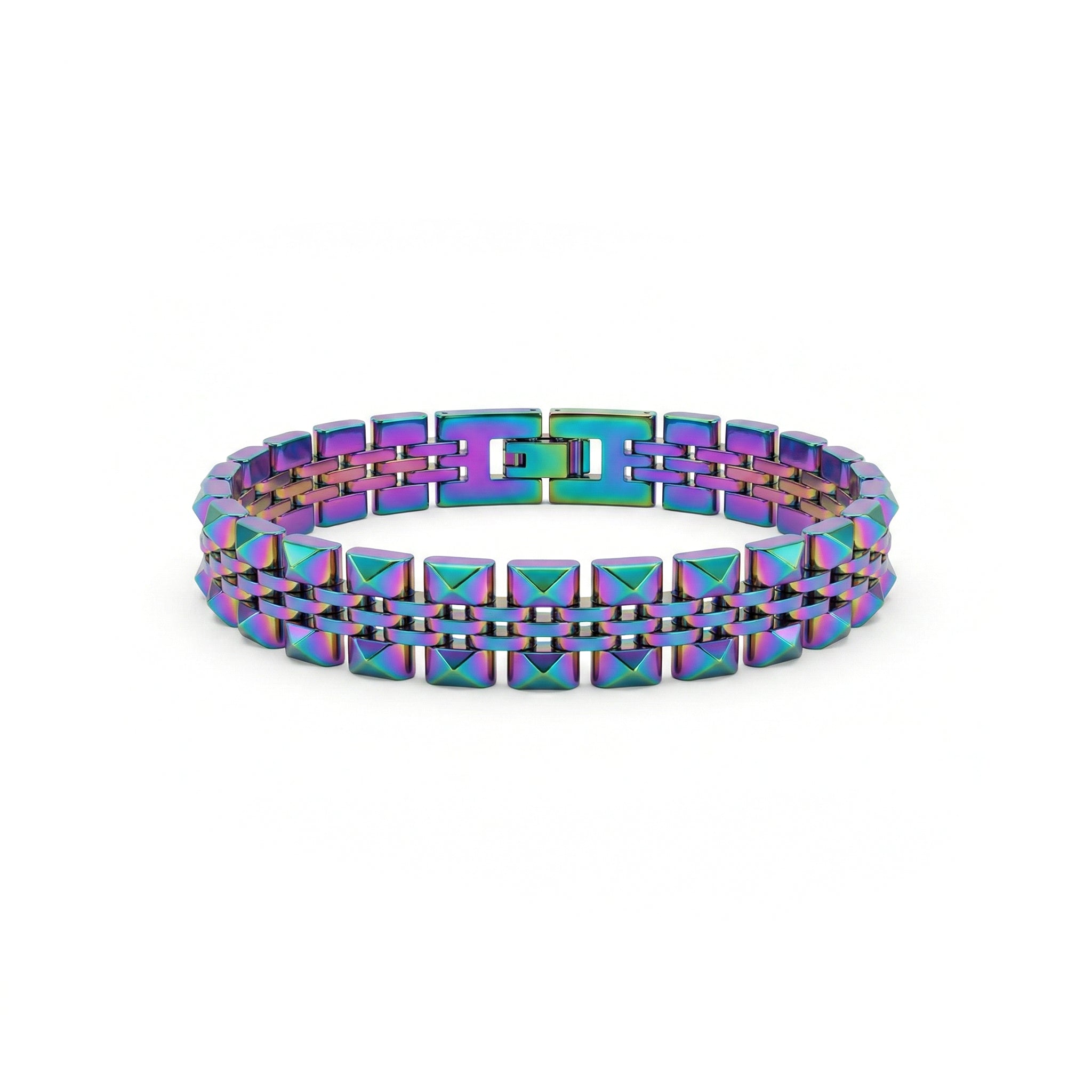 Brazalete articulado con eslabones de relieve, Su acabado Iridescent PVD interactúa con la textura creando un efecto visual de Glitch. Tacto rugoso industrial y cierre invisible para un flow continuo en la muñeca.