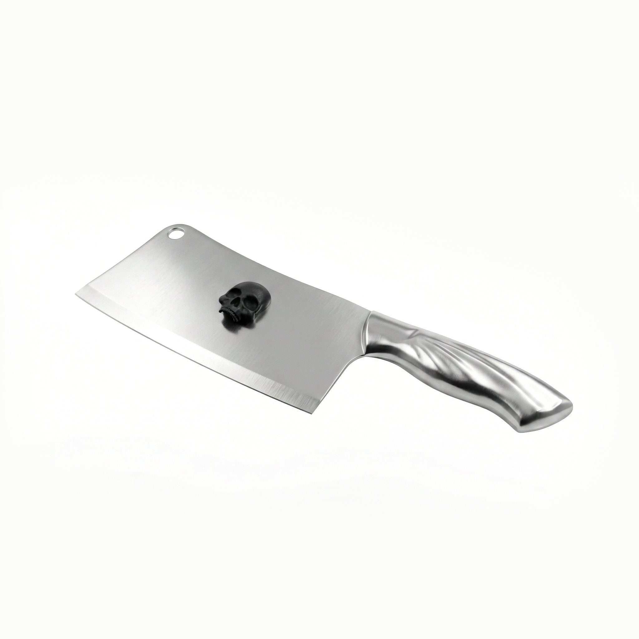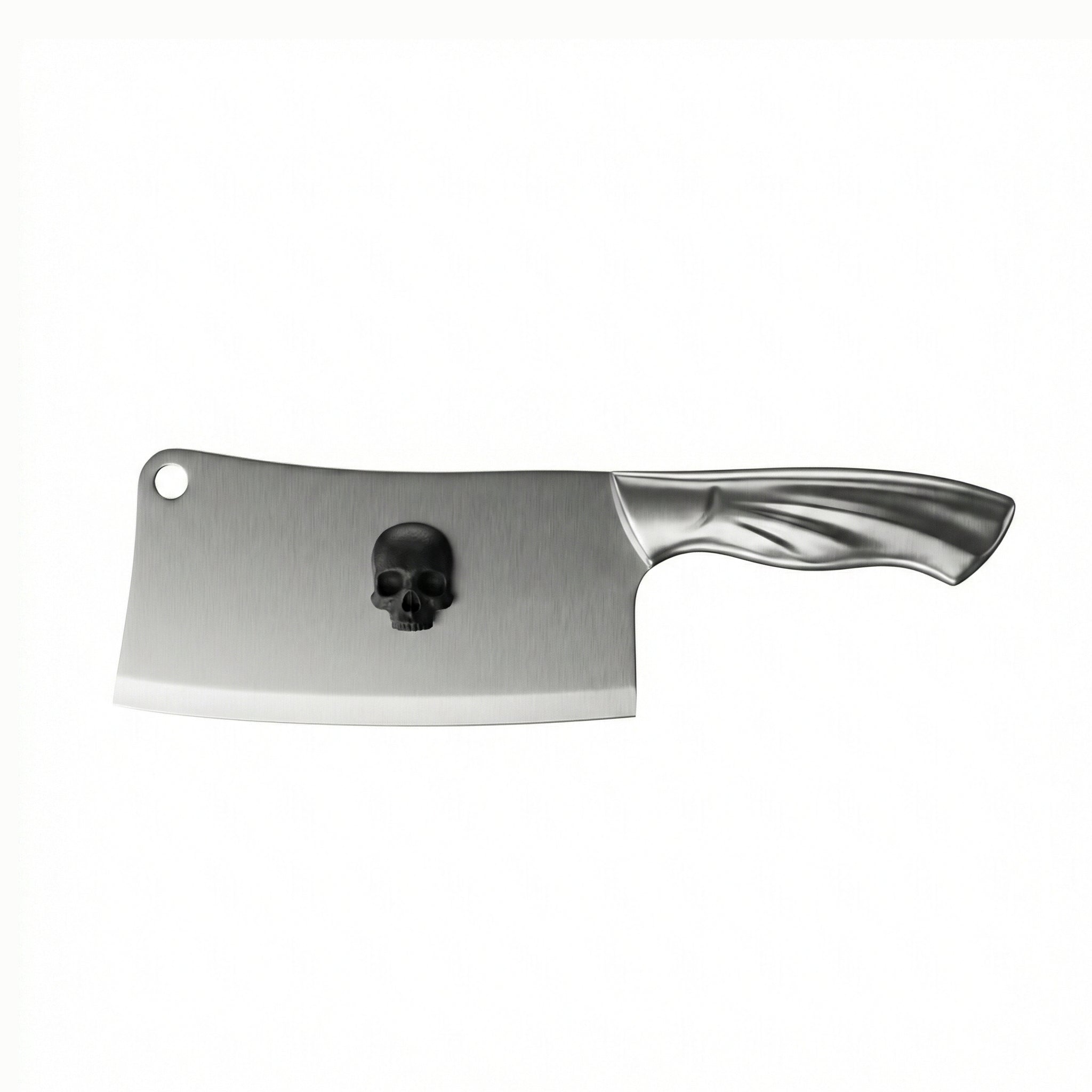 Machete para cocina con silueta de hachuela (Cleaver) fabricada en acero inoxidable de una sola pieza. La hoja presenta un acabado satinado industrial interrumpido por un emblema craneal en negro mate (Matte Black Icon). Empuñadura metálica de flujo ergonómico que aporta un balance visual frío y contundente.